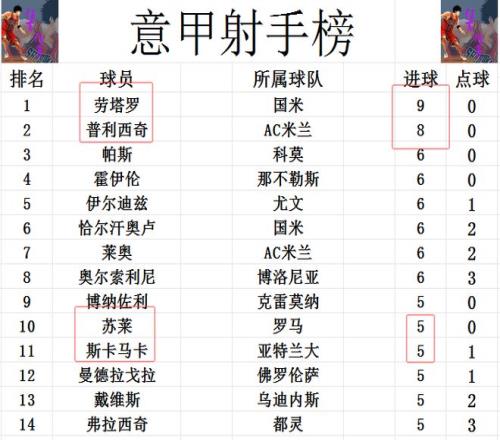 射手榜方面,还是无人进球上双,劳塔罗9球领跑,普利西奇8球紧随其后,霍伊伦,帕斯,伊尔迪兹,莱奥等人6球并列第3。斯卡马卡和苏莱今天都无力进球,哈市和博纳佐利等人5球刚好挤入前十。